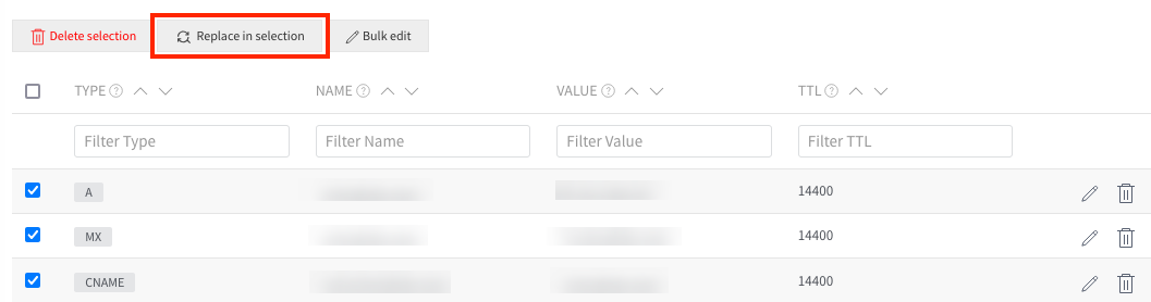 Sélectionnez les enregistrements DNS que vous souhaitez modifier, puis cliquez sur le buttons « Remplacer la sélection ». Une nouvelle fenêtre s’ouvre automatiquement.