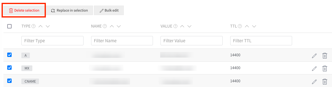 Depuis votre zone DNS, sélectionnez les enregistrements que vous souhaitez supprimer. Une fois un ou plusieurs enregistrements cochés, un bouton « Supprimer la sélection » apparaît en haut de la liste.