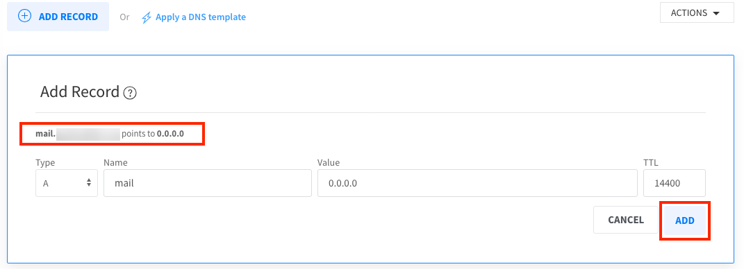 Astuce : Lors de la saisie, une ligne d’information s’affiche automatiquement au-dessus du formulaire pour vous montrer à quoi ressemblera votre enregistrement final (par exemple : mail.votredomaine.com pointera vers 0.0.0.0). Cela vous permet de vérifier immédiatement que vos données sont correctement saisies.