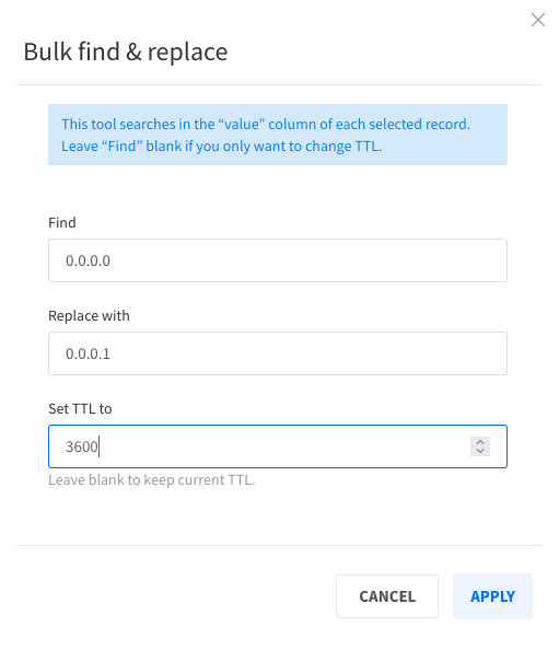 Cette fonctionnalité permet de modifier en masse des parties spécifiques des valeurs DNS (comme une adresse IP ou un texte) dans tous les enregistrements sélectionnés. Le remplacement s’effectue uniquement si la valeur ciblée est trouvée.