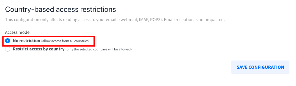 Par défaut, cette option est désactivée, ce qui signifie que vos comptes e-mail sont accessibles depuis tous les pays.